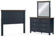 | Details | B414-87: Made with hardwood solids, mindi wood veneer and MDF substrates, Two-tone finish features a dark slate blue with a light brown wood-tone top, ¼" bolts (not included) are needed to attach headboard to your existing bed frame, Assembly required, B414B1: Includes dresser and mirror, Made with hardwood solids, mindi wood veneer and MDF substrates, Two-tone finish features a dark slate blue with light brown wood-tone top, Nickel-tone metal knobs, 6 drawers with fully finished interior, dovetail construction and heavy duty ball-bearing side glides, Mirror attaches to back of dresser, | |