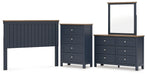 | Details | B414-57: Made with hardwood solids, mindi wood veneer and MDF substrates, Two-tone finish features a dark slate blue with a light brown wood-tone top, ¼" bolts (not included) are needed to attach headboard to your existing bed frame, Assembly required, B414B1: Includes dresser and mirror, Made with hardwood solids, mindi wood veneer and MDF substrates, Two-tone finish features a dark slate blue with light brown wood-tone top, Nickel-tone metal knobs, 6 drawers with fully finished interior, dovetail construction and heavy duty ball-bearing side glides, Mirror attaches to back of dresser, B414-45: Made with hardwood solids, mindi wood veneer and MDF substrates, Two-tone finish features a dark slate blue with a light brown wood-tone top, Nickel-tone metal knobs, 4 drawers with fully finished interior, dovetail construction and heavy duty ball-bearing side glides, | |