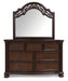 Details B764B5: Includes poster headboard/footboard panels, rails and headboard posts, Made with hardwood solids, cherry veneer with MDF substrates, decorative cast resin and furniture grade plastic components , Cherry brown finish, Headboard with metallic accent filigree, Foundation/box spring required, sold separately, Mattress available, sold separately, Assembly required, B764B1: Includes dresser and mirror, Made with hardwood solids, cherry veneer with MDF substrates, decorative cast resin and furniture grade plastic components , Cherry brown finish, Decorative metal drawer pulls with dark bronze-tone finish, 7 drawers with fully finished interior, dovetail construction and ball-bearing side glides, Mirror attaches to back of dresser, B764-46: Made with hardwood solids, cherry veneer with MDF substrates, decorative cast resin and furniture grade plastic components, Cherry brown finish, Decorative metal drawer pulls with dark bronze-tone finish, 5 drawers with fully finished interior, dovetail construction and ball-bearing side glides,