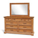This Mossy Oak bedroom set was built with mahogany solids and veneers. The case-piece drawers have full extension guides, decorative hardware, and corner brackets.