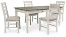 Set the scene for coastal chic or modern farmhouse living with this 5-piece dining room set. The clean-lined, simply striking table doubles the charm with its warm brown plank-effect top and grayish white base. Two convenient side drawers and a lift-top bin offer abundant storage options. Four upholstered, ladderback chairs sport a grayish white finish with rubbed through effect for a timeworn appeal.