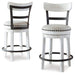 | Details | D546-13: Made of pine wood, veneers and engineered wood, Two-tone finish, Black metal footrest, Seats up to 4, Assembly required, D546-524: Made with wood, engineered wood and metal, Vintage white finish, Cushioned seat with linen colored polyester upholstery, Smooth 360-degree swivel, Nailhead trim detail, Assembly required, | |
