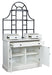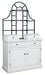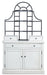 Details Includes baker's rack base and hutch, Made with hardwood solids, mango wood veneer, MDF substrate and metal , Antiqued white finish, Frame with black finish, Dark pewter-tone knobs , Metal hutch with 2 wood shelves, 2 single-door cabinets (each with one shelf), 3 drawers with felt lining , 6 small hooks for hanging mugs and small accessories, Assembly required
