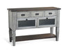 The Homestead Hills grey server was built with mahogany wood solids and veneers. The rough sawn distressing complements with a gorgeous two-Tone tobacco leaf and alpine grey finish and drop-down doors with waterfall glass. Stow away silver wear or other accessories in the felt lined drawers.