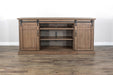 This modern 78" entertainment stand will complement the furnishings in your living room. The ideal component for all of your storage needs, complete with sliding barn cabinet doors, wire management is made simple by cutouts in the rear. Its easygoing character is sure to enhance the look of any room.
