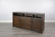 This Homestead entertainment console was built with rough-sawn mahogany solids and veneers. The rustic hardware and visible wood grain add character to its beautiful Tobacco Leaf finish.