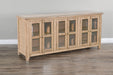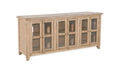 This TV console was built with rough-sawn mahogany solids and veneers, glass doors, and adjustable shelves.
