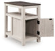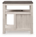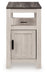 Embrace simply stylish sofa-side function with this chairside end table. Keep entertainment essentials like remotes, coasters and more close with the handy storage cabinet. Battery running low? Built-in USB ports keep easy charging at your fingertips. And with the table's two-tone look in gray and antiqued white, it has the versatility to pair with aesthetics from casual to farmhouse.