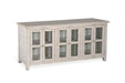 This 70" TV console was built with rough sawn mahogany solids and veneers with glass doors and was beautifully finished.