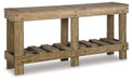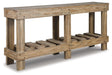 As this console table proves, sometimes less is more. Dramatically transform your living space with the warm and rustic appeal of solid wood construction and open-slat shelving. Washed in a light brown finish, this sofa table sets a new standard for down-to-earth refinement.
