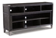 Make watching TV a joy. This TV stand's rustic-industrial style—with a gray finish, squared edges, zinc-tone corner bracket accents and nailhead detailing—is sure to complement any contemporary decor. Several vented open cubbies offer impressive shelf space, convenient for keeping all of your electronic gear within reach. Handy cutouts keep cords out of sight. The stand's large center opening accommodates a shelving insert (included) or an optional fireplace insert (sold separately).